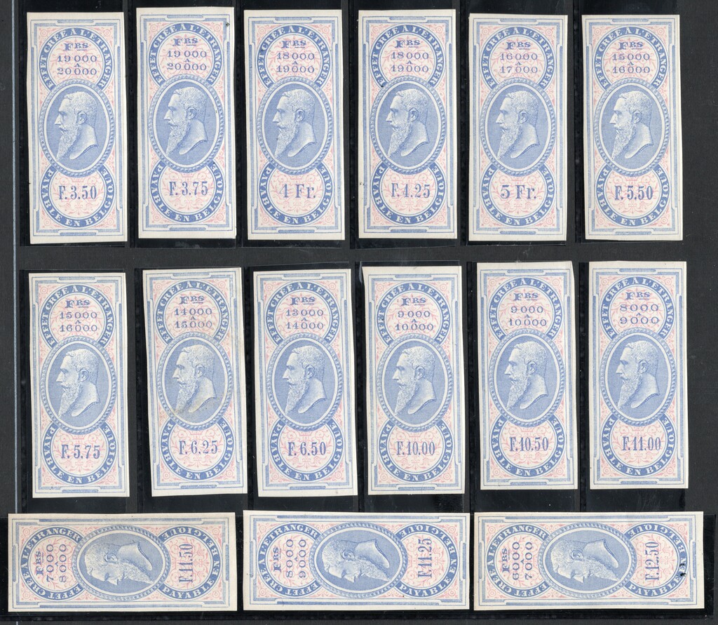Essays of 1884 Leopold design but with bicolour design, various rates to high values, all imperf four margins, mint with light hinge and very fresh, 25 different values including 50F top value (shown over two scan pages, click either of the two thumbnails to enlarge each group)