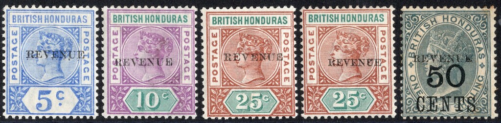 1899 "REVENUE" ovpt on QV, the set of four (50c brownish gum), plus additionally the extra variety 11mm long on 25c, mint light hinge (SG 66/69 plus 68a, cat £358).
